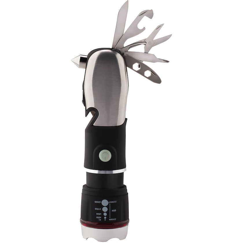 Lommelygte med flere indbyggede værktøjer. Holbrook har tre lysindstillinger med zoom funktion. Drives med 3 stk. AAA-batterier (ikke inkluderet).