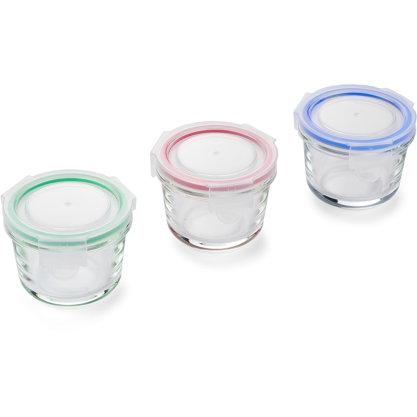 Sæt med tre små glasskåle. Skålene er fremstillede af borosilikatglas der tåler store temperaturforskelle. Trykprisen afser tryk på en af skålene. Skålene tåler uden problemer opvaskemaskine, mikrobølgeovn, ovn samt fryser.