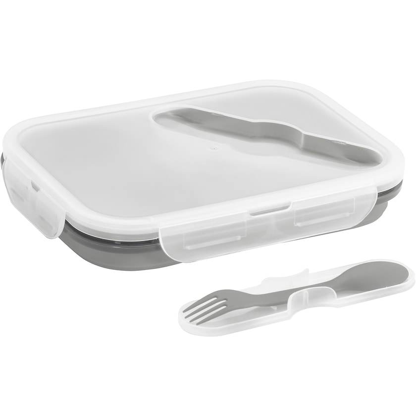 Foldbar madkasse med to rum. De to rum rummer hhv. 76 og 48 cl. En kombineret gaffel og ske medfølger. Hvis låget fjernes kan madkassen tåle mikrobølgeovn.