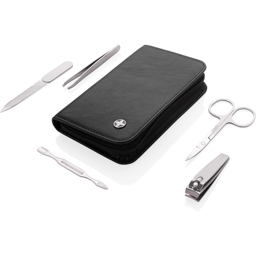 Eksklusivt negleplejesæt fra Swiss Peak. Sættet indeholder 5 dele, der alle er af rustfrit stål. Mærkning laves med gravering på etuiets kunstlæder.