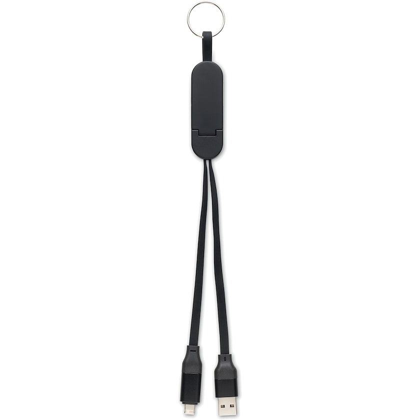 60W-ladekabel af genanvendt ABS. Fungerer også som mobilholder. Indgang: 2-i-1 Type-C og Type-A. Udgang: Type-C og mikro-B (2 i 1 stift).