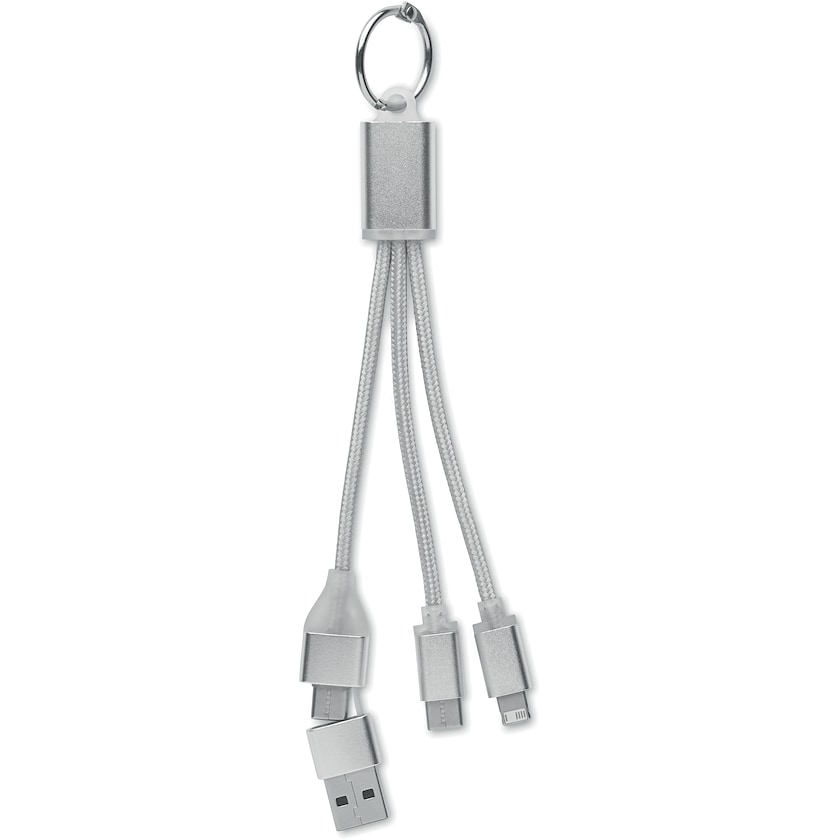 Ladekabel med nøglering og tre stik. Stik er af typen 2-i-1-type-C & A, mikro-B samt type-C. Vælg mellem tryk og lasergravering.