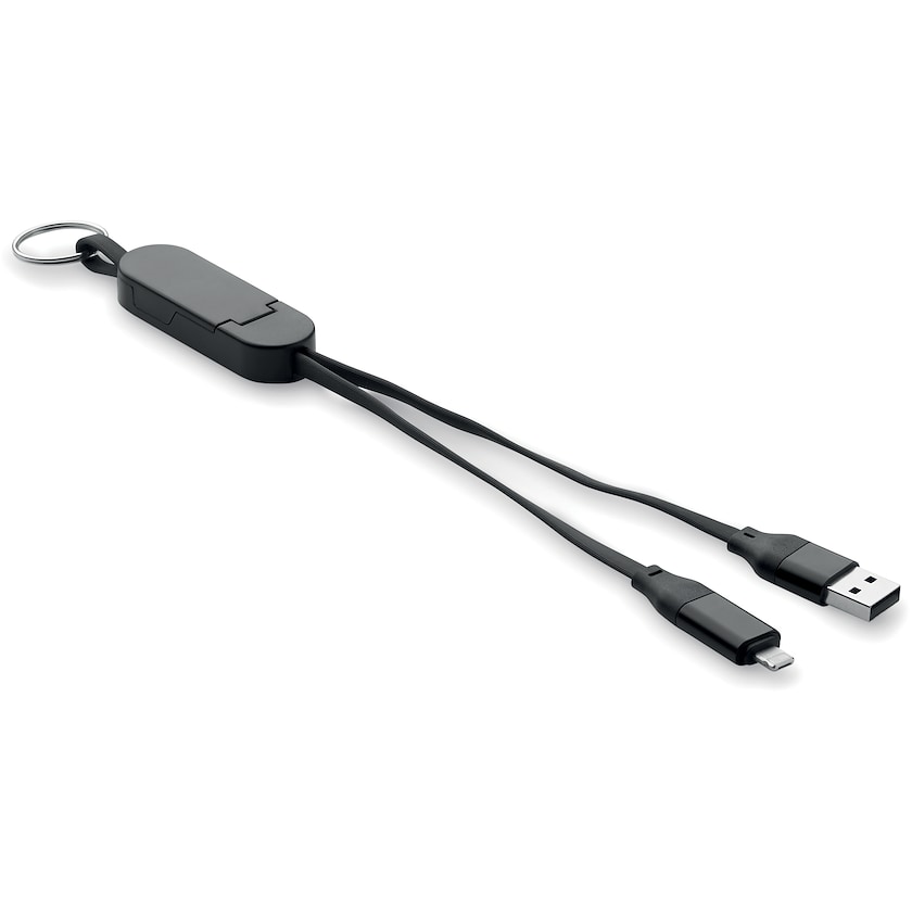 Opladerkabel som også fungerer som mobilholder. Kabellængden er 26 cm. Ingang: 2-i-1 Type-C og Type-A. Udgang: Type-C og micro-B (2 i 1 stift).