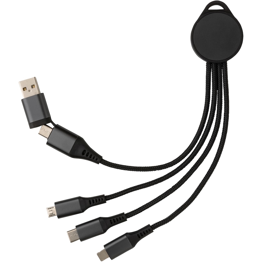 Opladerkabel af genbrugsmateriale. Ulysses er fremstillet af genanvendt aluminium, TPE og PET. Opladerkablet har i alt 6 oplader muligheder. Kablet har en længde på 12 cm. Leveres i en gaveæske af FSC-certificeret papir.