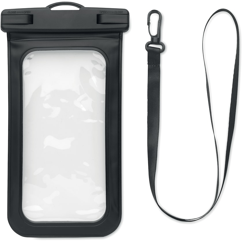Vandtæt mobillomme med aftagelig rem. Vandtæt i henhold til klassificering IPX 8. Passer til mobiltelefoner med maksimalt 6,7 tommers skærm. Kun 1-trykfarve er mulig.