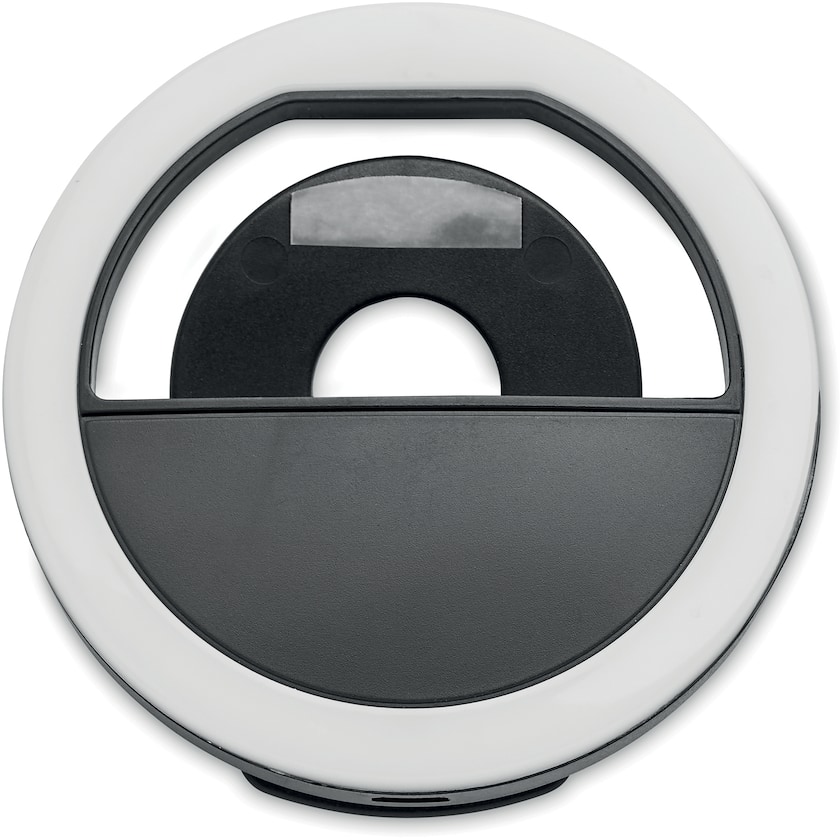 Selfie ring til mobiltelefon. Delmy har 28 stk. LED-pærer og giver perfekt lys til dine billeder og film. Vælg mellem tre forskellige lysstyrker. Selfie ring belysningen drives med et genopladeligt batteri.