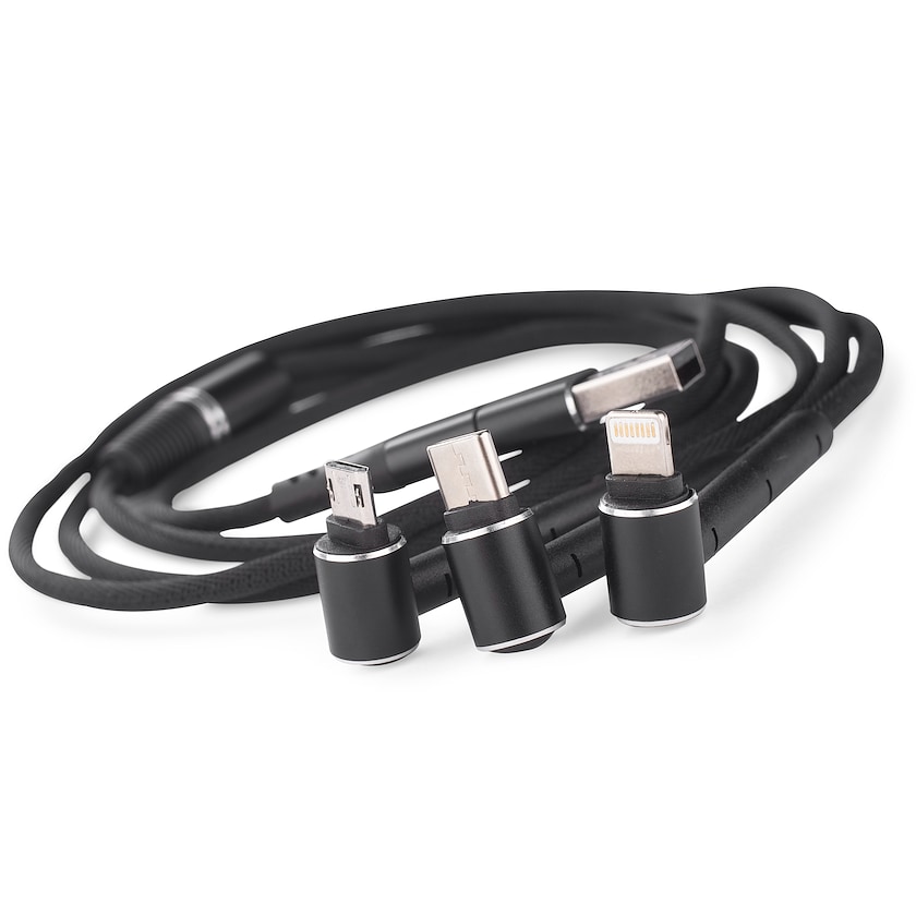 USB-kabel med seks funktioner i én. Kablet har to input ved USB-A og USB-C og tre output med micro-USB, USB-C samt lightning (iPhone). De tre output-kabler er forstærkede så de også kan bruges som mobilholder.