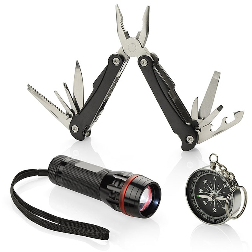 Eksklusivt gavesæt bestående af multiværktøj, kompas og lommelygte. Eksklusivt gavesæt indeholdende lommelygte og multiværktøj. Lommelygten har en meget stærk lysdiode, justerbart lys med zoomfunktion, samt tre forskellige lysstyrker; stark, svag og blinkende. Både lommelygten, multiværktøjet og kompasset er fremstillet af metal, og leveres i en elegant sort gaveæske. Mærkning sker med lasergravering, og maksimal mærkningsstørrelse er 80 x 20 på lommelygten, og 60 x 7 mm på multiværktøjet og 30 x 30 mm på kompasset.