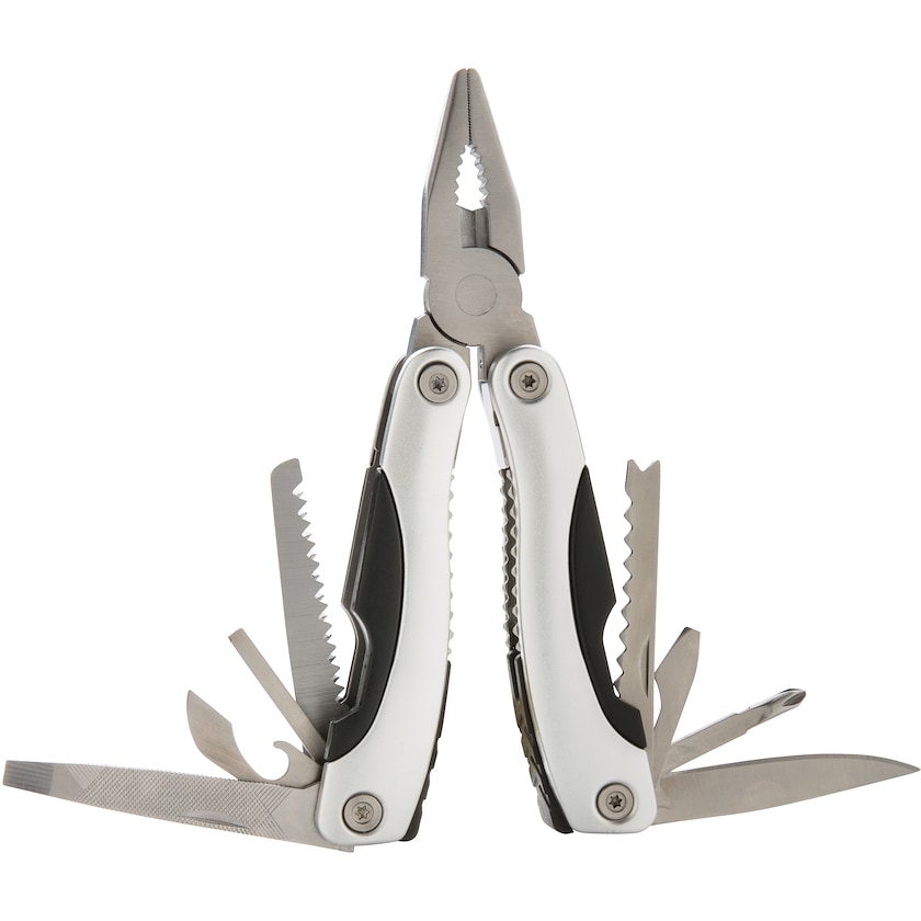 Multiværktøj i aluminium med 14 funktioner. Leveres i et praktisk opbevaringsetui.