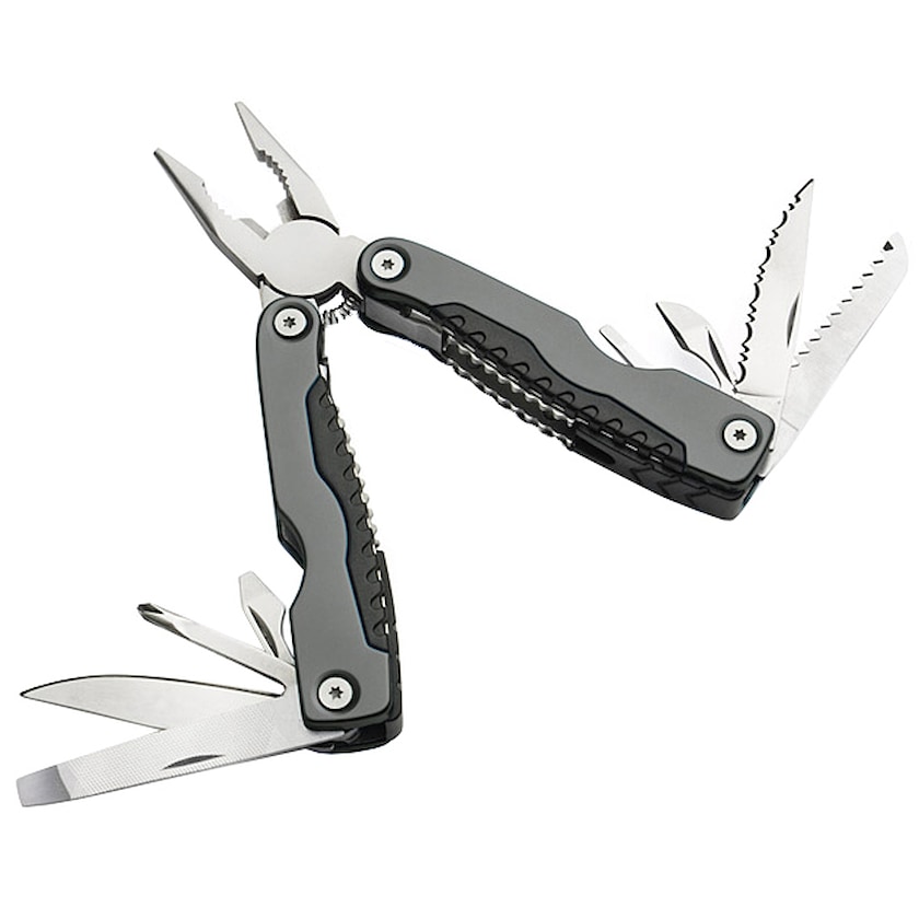 Robust multitool med metalhåndtag. Indeholder tang, sav, oplukker, proptrækker, træ- og metalfil, saks, en stjerneskruetrækker og to knive. Lasergravering sker på et af håndtagene.