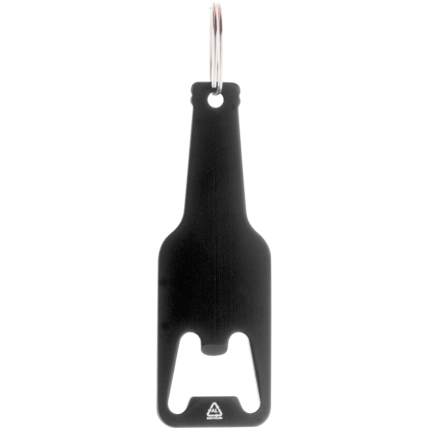 Flaskeformet oplukke i genanvendt aluminium. Perfekt for nøgleringen. Mærkning laves med tryk eller lasergravering.