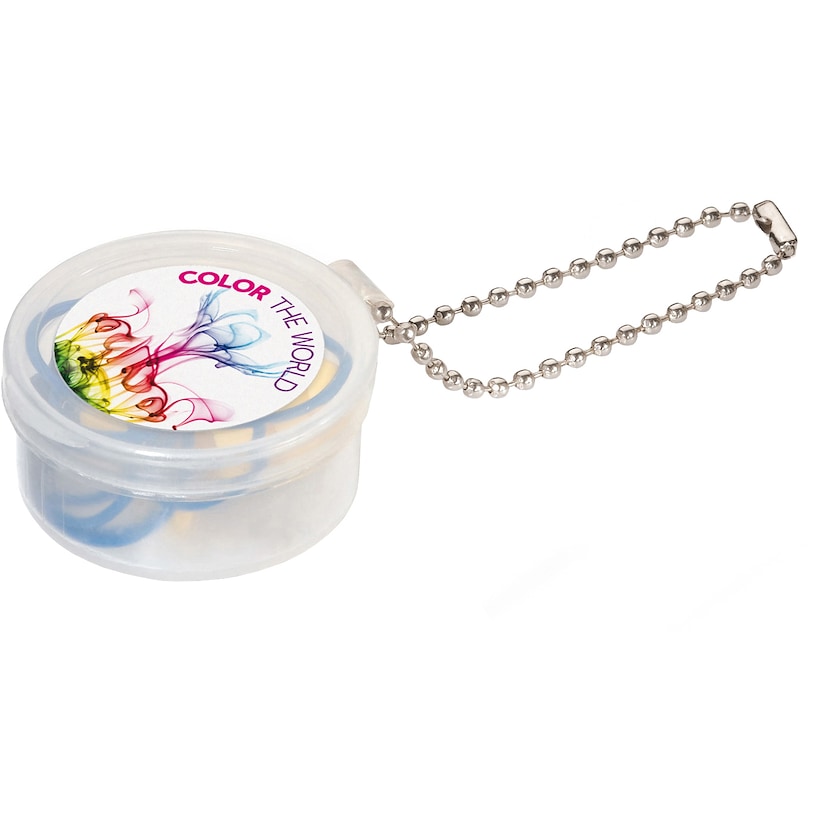 Lille plastikdåse med ørepropper med etiket som digitaltrykkes. Plastikdåsen er forsynet med en lille metalkæde. Ørepropperne er koblet sammen med en snor hvilket gør at man kan hænge dem rundt om halsen når man ikke anvender dem.