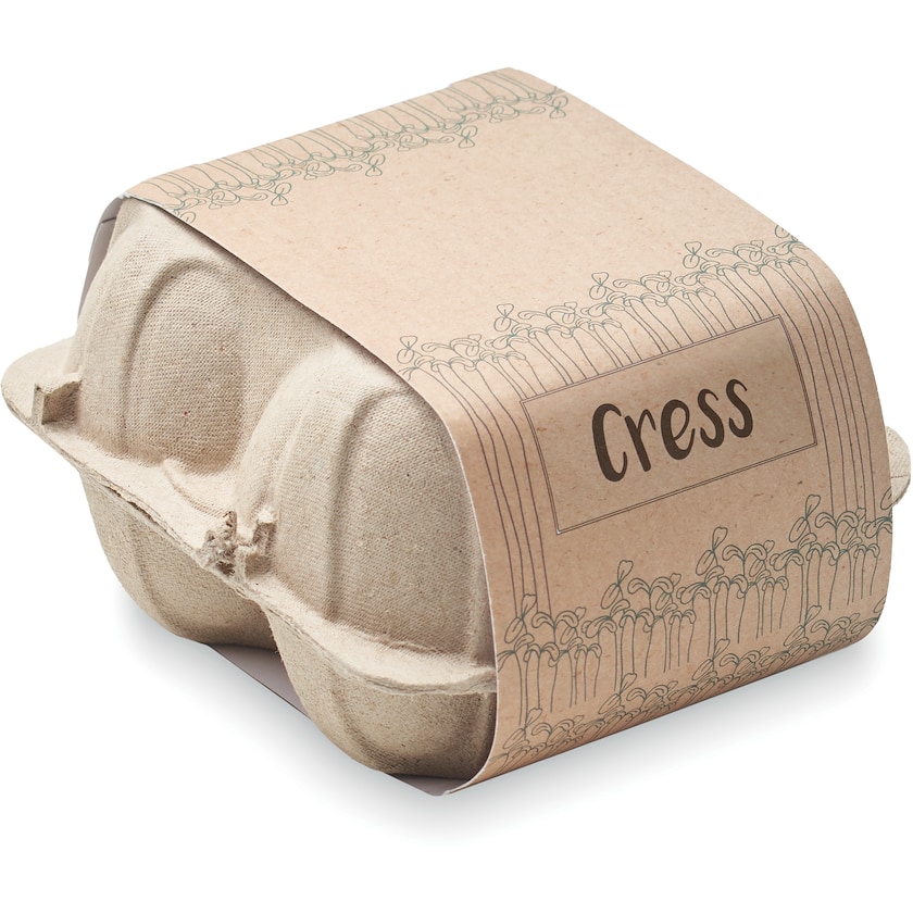 Dyrkningssæt til karse i en flot æggekarton. Sættet består af fire lerkrukker fyldt med jord og frø. Trykket laves på papirbanderollen som omslutter æggekartonen. Produceret i EU.