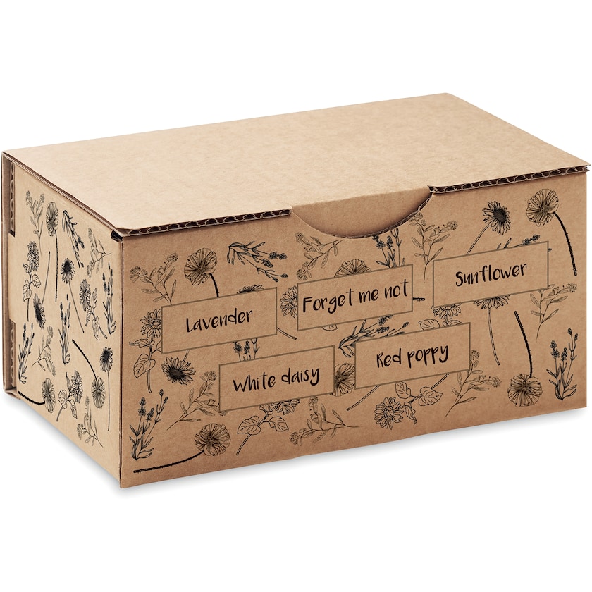 Dyrkningssæt til at dyrke fem forskellige blomster. Blomsterne er lavendel, forglemmigej, solsikke, tusindfryd og valmue. Dyrkningssættet er fremstillet inden for EU. Trykket laves på æskens låg.