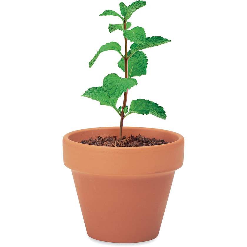 Potte af terrakotta med jordtablet og myntefrø. Mærkning laves enten med 1-trykfarve eller lasergravering. Fremstillet i EU.