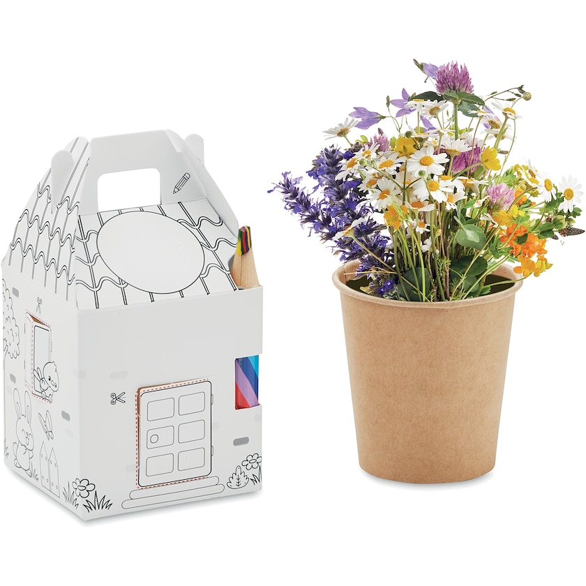 Dyrkningssæt til børn. Inkluder potte i naturfarvet pap, frø til honningblomster samt en flerfarvet farveblyant.