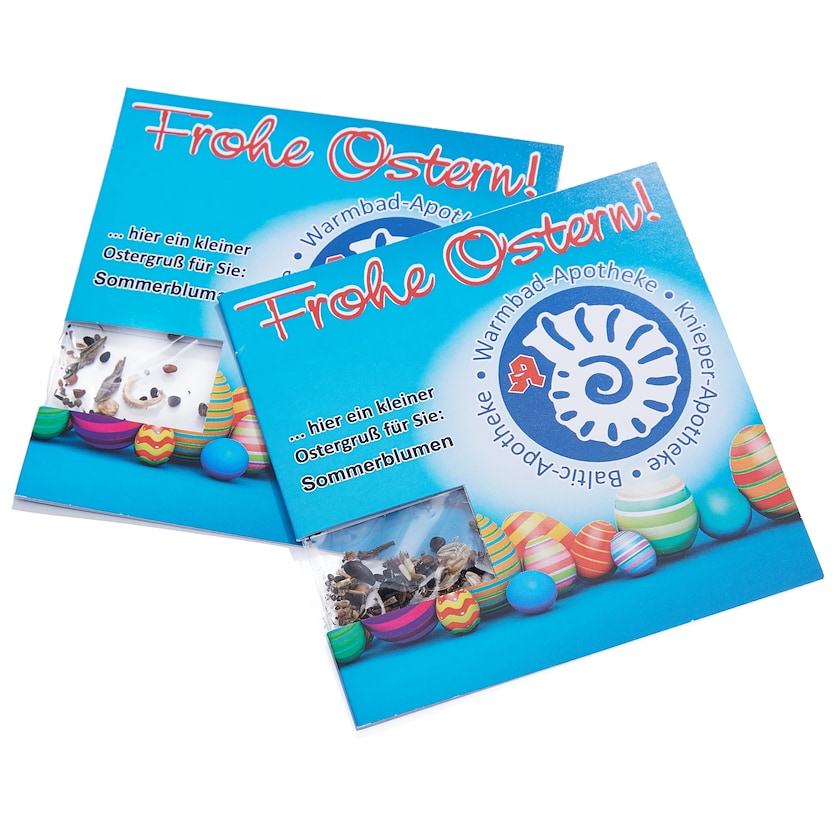 Innovativt frøkort med rude der viser frøene. Værdsat af alle kunder! Fås med frø til solsikker, sommerblomster, morgenfruer, margueritter, basilikum, eller karse.