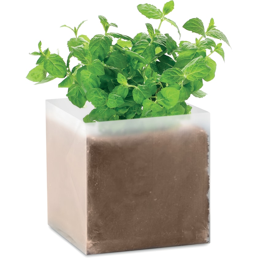 Sæt til dyrkning af mynte. Tilsæt ca. 30 cl vand og du har 1 liter dyrkningsmuld hvor der snart spirer mynte op. Tryk laves med 1-trykfarve på emballagen.