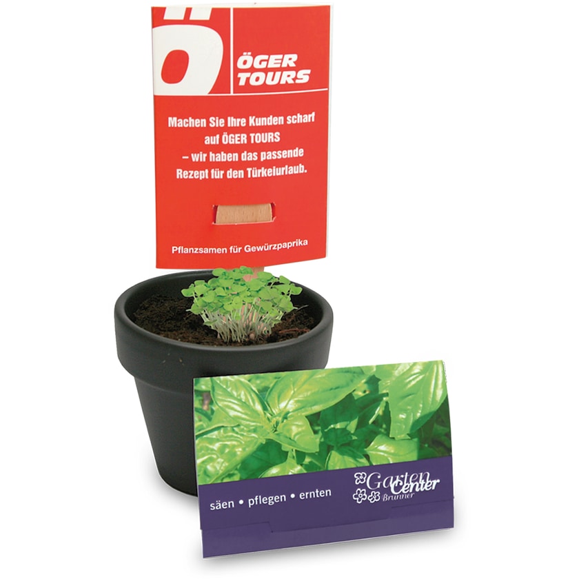 Træpind med frøene fæstnet på et papkort med tryk. Pinden løsnes fra kortet og stikkes ned i en krukke med jord. Derefter tager naturens kræfter over, og snart spirer planten. Kortet kan fæstnes på pinden igen, så budskabet fortsat spredes. Kortet trykkes med digitaltryk.