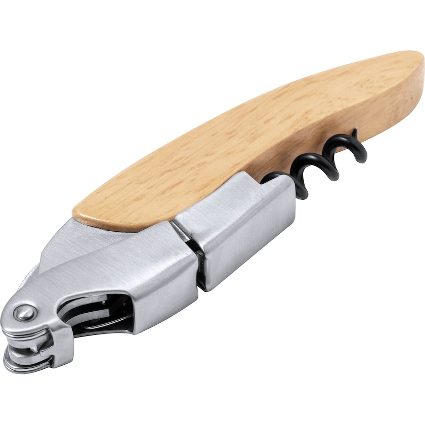 Proptrækker af rustfri stål og lyst træ. Mærkning kan enten laves med lasergravering eller tryk i maksimalt to farver.
