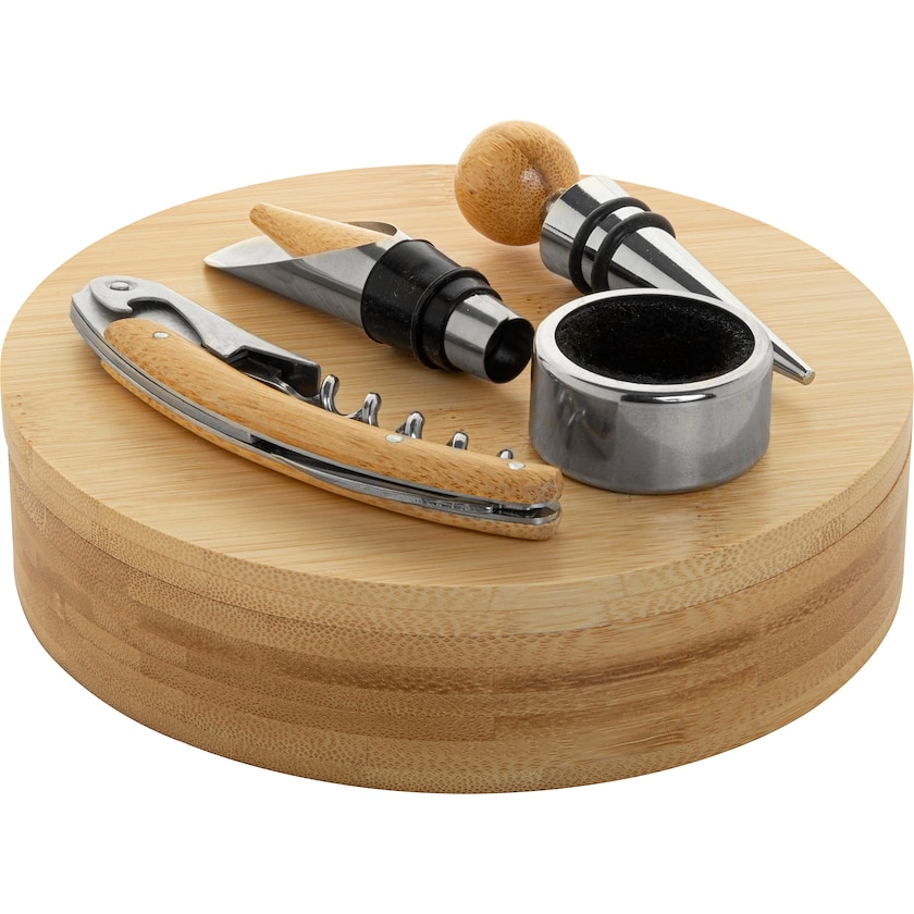 Vinsæt med fire vintilbehør i rund bambuskasse. De fire vintilbehør er lavet af bambus og stålfri stål. En fantastisk gave til vinelskeren.