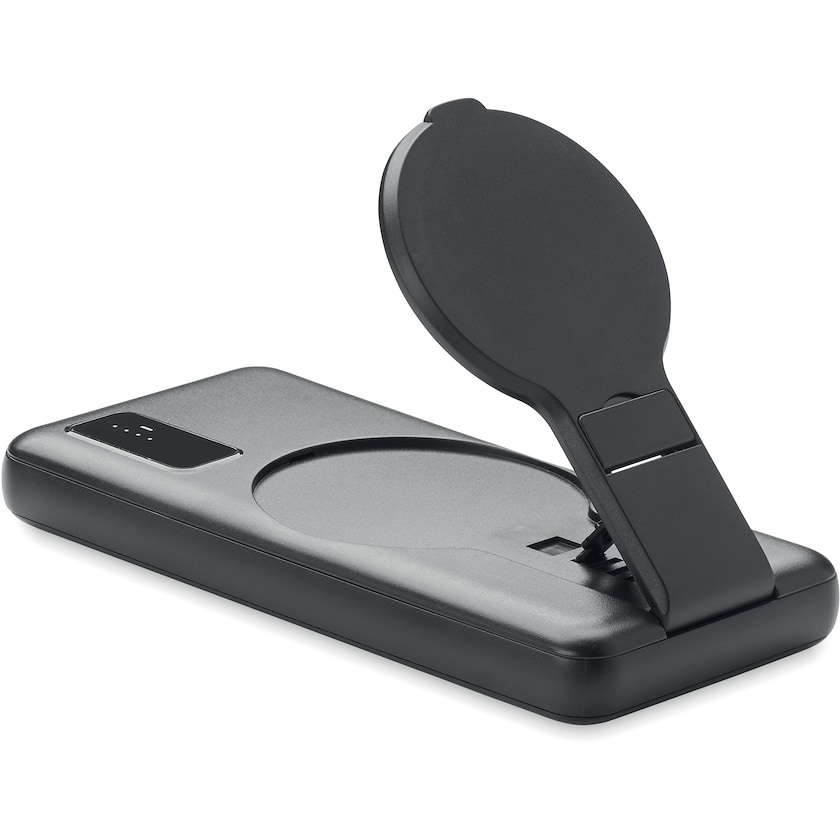Powerbank med magnetisk stativ og trådløs oplader. Kompatibel med iPhone 12 og nyere. Inklusiv ekstra magnetisk metalring for at understøtte opladning af andre ikke-magnetiske trådløse genopladelige telefoner.