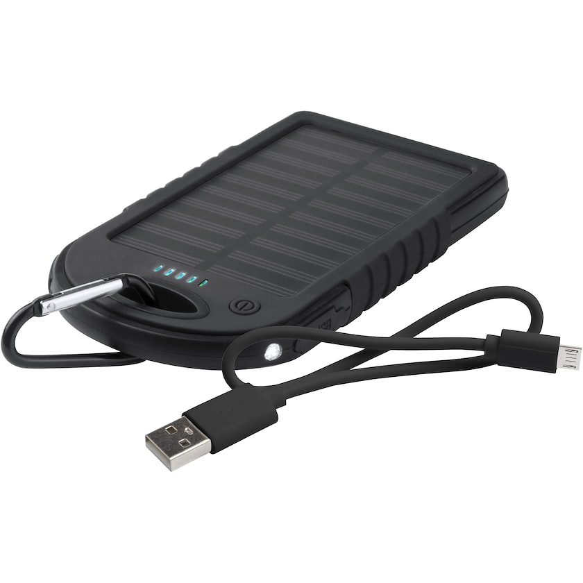 Soldrevet powerbank med LED-lys. Hector har et beskyttende dække af silikone, der beskytter mod stød. Micro-usb-kabel medfølger. Tryk kan ske i maksimalt 2 farver.