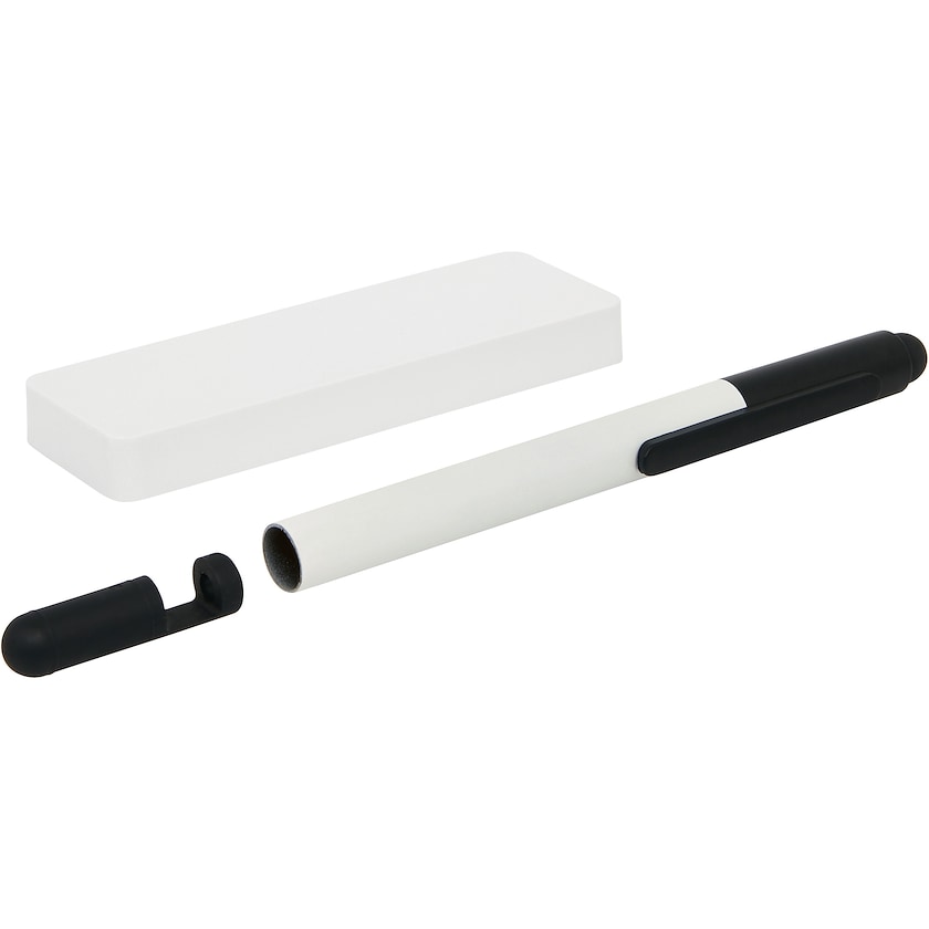 Sæt med powerbank og touchpen. Pennen fungerer også som mobilholder. Powerbanken har output 5V/1A og input 5V/1A. Micro-USB-kabel medfølger. Trykprisen indikerer tryk på enten powerbanken eller pennen. Leveres i en sort gaveæske.