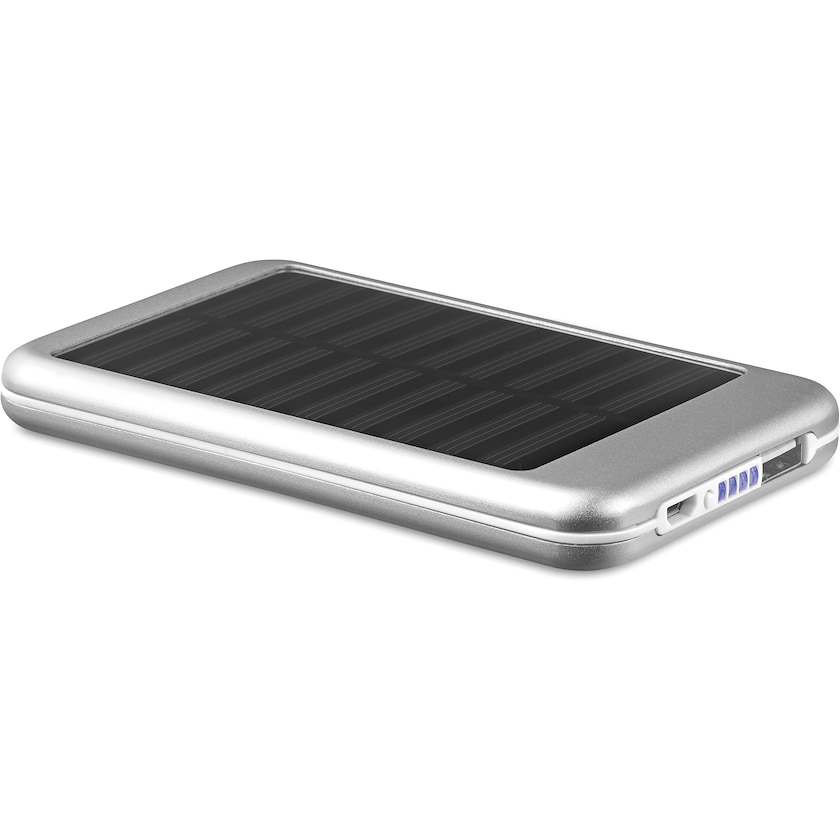 Powerbank med logo med solcelle opladning. Powerbanken er fremstillet i aluminium og kan oplade din mobil ca. to gange når den er fuldt opladt. Mikro-USB-kabel følger med.