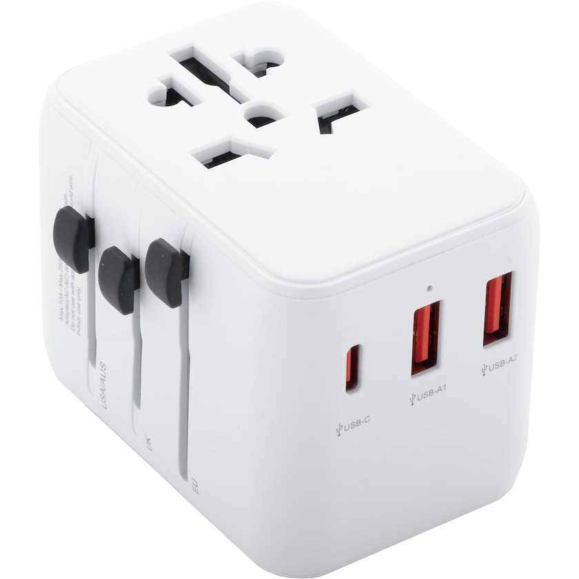 Rejseadapter med hurtigopladning. Nagano har stik til USA, Europa, Storbritannien og Australien samt 2 stk. USB-stik og 1 stk. USB-C-stik til hurtigopladning.