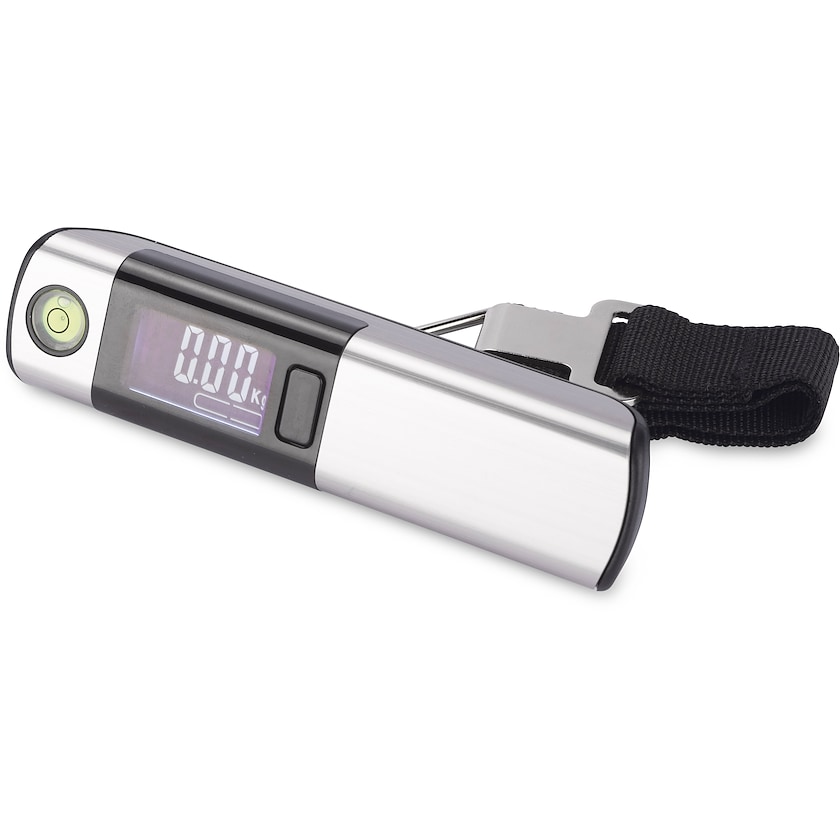 Bagagevægt med LED-skærm. Har en alarm der advarer hvis vægten overstiger 20 kg. Kan maksimalt holde til 50 kg. Kan vise vægt i kg, oz og lb. Har også et 1 meter målebånd og et vaterpas. Drevet af et CR2032-batteri (ikke inkluderet).