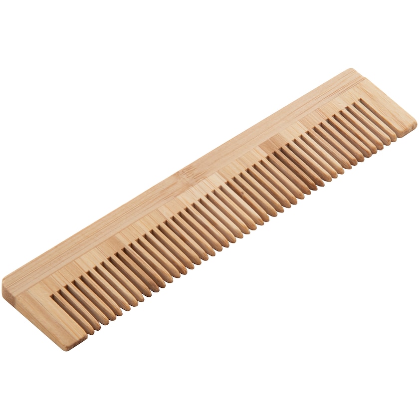 Højkvalitets kam af ægte bambus. Kammen leveres i naturfarvet papetui. Mærkning kan enten laves med tryk eller lasergravering.