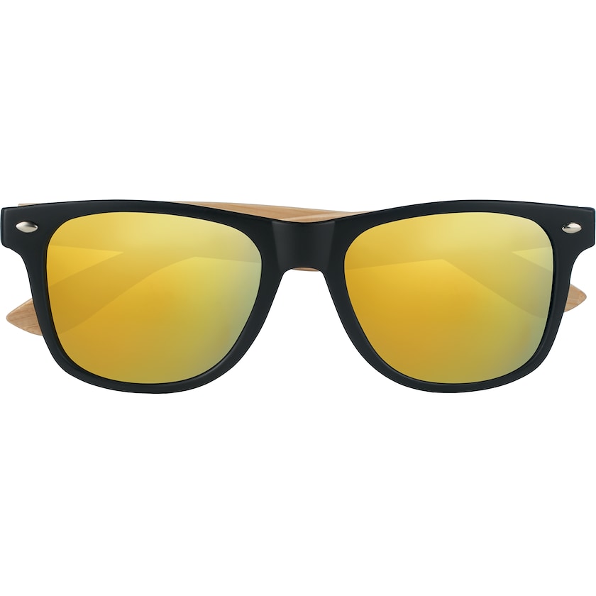 Solbriller med spejlglas og bambusstel. Glassene har UV400-beskyttelse. Mærkningen kan enten laves med tryk eller lasergravering på det ene eller begge stel.