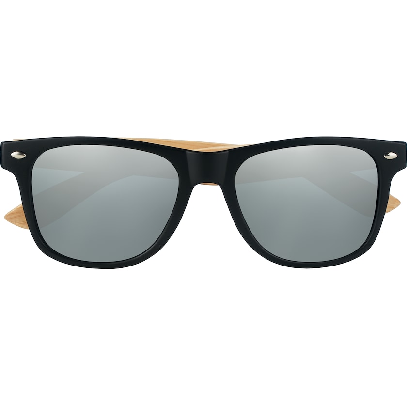 Solbriller med spejlglas og bambusstel. Glassene har UV400-beskyttelse. Mærkningen kan enten laves med tryk eller lasergravering på det ene eller begge stel.
