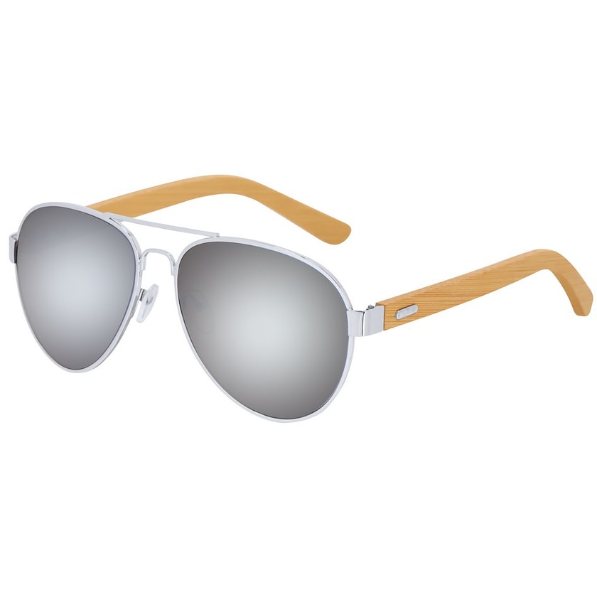 Pilot solbriller med spejlglas. Linserne er med UV400-beskyttelse. Stængerne er lavet af bambus. Leveres i en pose af mikrofiber.