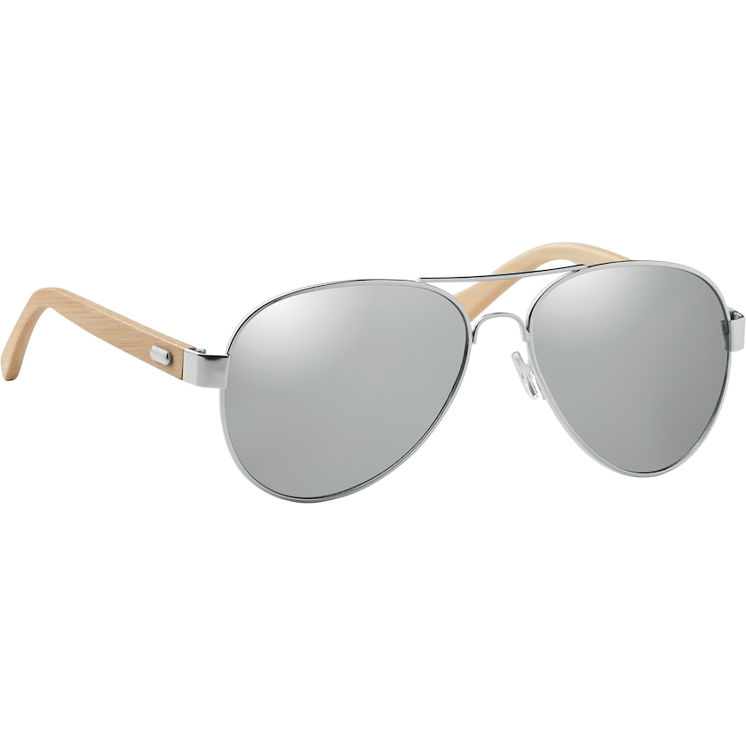 Solbriller i klassisk pilotmodel. Brillestellet er fremstillet i bambus og glassene fås i forskellige farver. Glassene har UV400-beskyttelse. Leveres i en brillepose af mikrofiber i matchende farve. Lasergraveringen laves på brillestellet og trykkes på brilleposen.