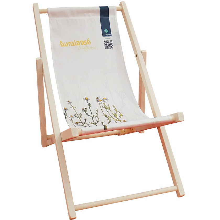 Klassisk solstol til børn med logo. Solstolen har mindre mål end normalt. Vælg mellem syv forskellige farver på træet. Stoffet trykkes med digitaltryk.