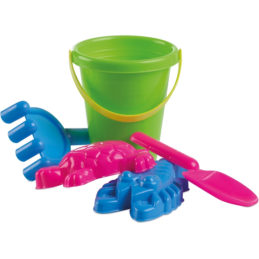 Farveglad sæt med strandlegetøj. Sættet indeholder spand, skovl, rive og to forme. Børns favorit på stranden!