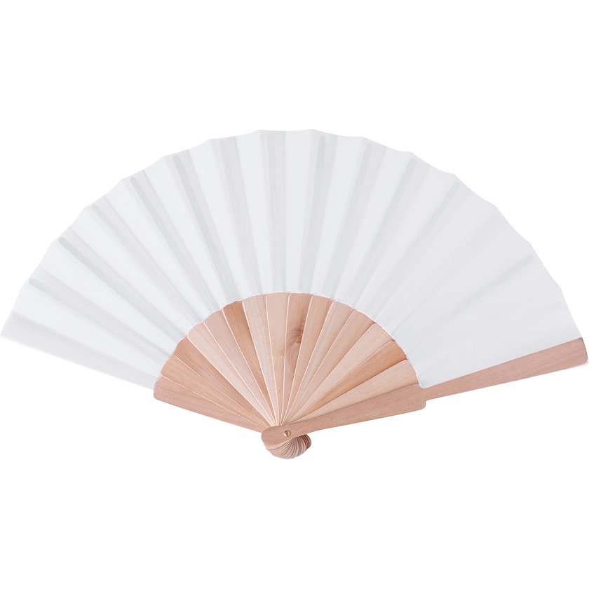 Vifte af træ og solidt stof af polyester og bomuld. Mærkning laves med tryk eller lasergravering på træribberne.