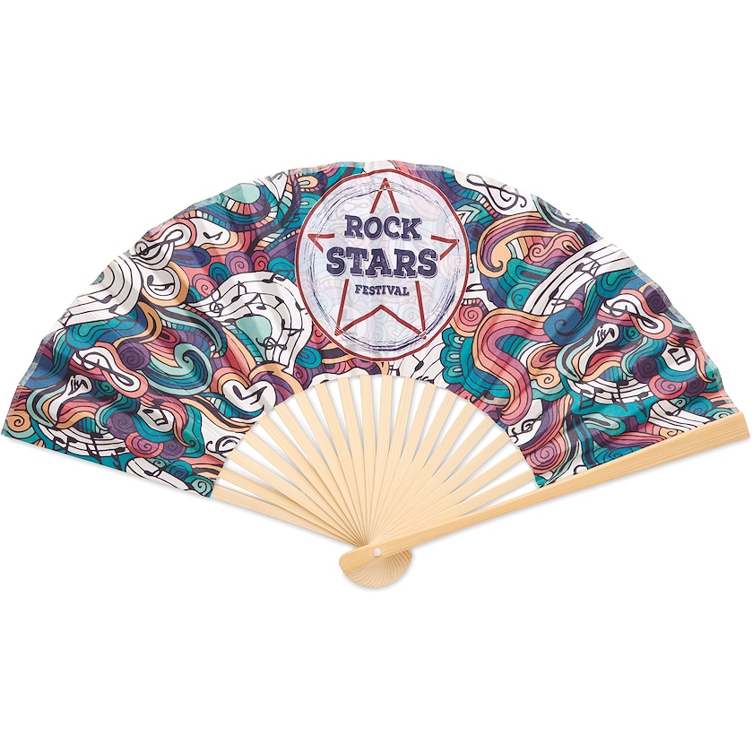 Vifte med logo på hele viftens ene side. Zaragoza er lavet af bambus og 80 grams papir. Hele overfladen som er tryk på billeder trykkes efter dine ønsker. Download skabelon og skab din unikke vifte i dag!