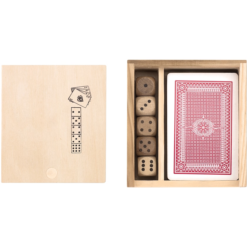 Sæt med et spil kort og fem terninger. Kortspillet indeholder 54 kort. Hele sættet leveres i en flot trææske. Et spillesæt som alle bør have i sit hjem!