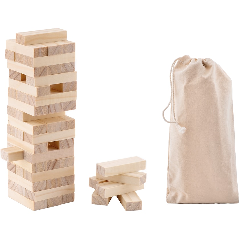 Klodsmajor spillet i træ. Spillet består af 54 byggeklodser. En opbevaringspose af bomuld er inkluderet. Trykket laves på opbevaringsposen. Et sjovt spil som både kræver intelligens og smidige fingre.