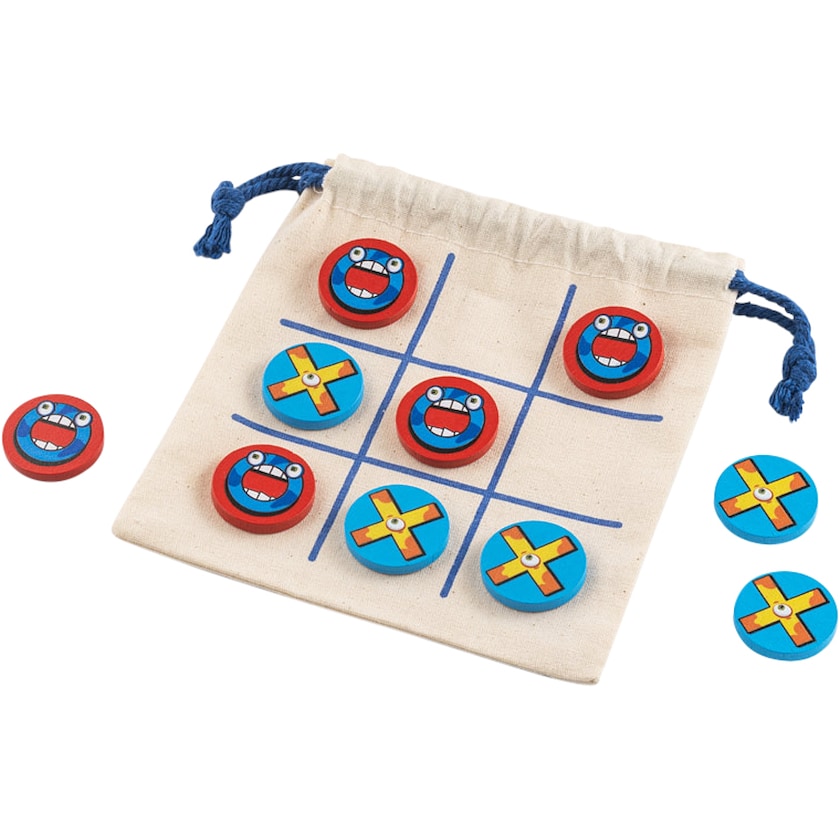 Klassisk kryds og bolle. Spillet leveres i en bomuldspose som også fungere som spilleplade. Trykket laves på bomuldsposens bagside. Spillebrikkerne er fremstillet i træ.