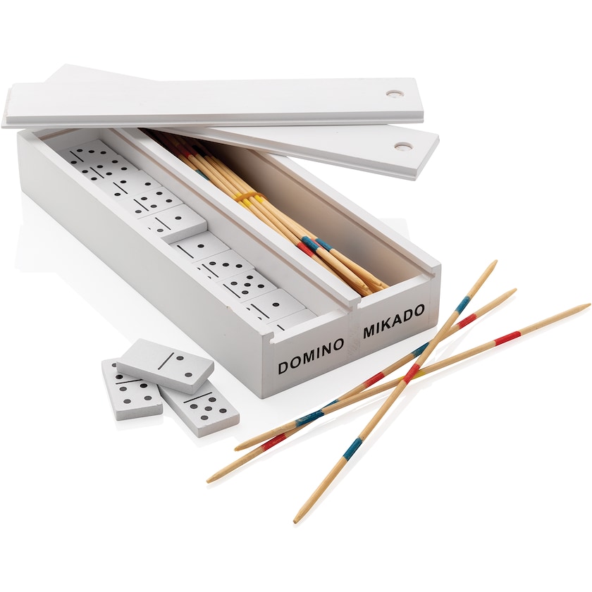 Sæt med to klassiske spil Mikado og Domino. Spil leveres i en smart hvid æske samt i en gaveæske. En perfekt gave for dig som ønsker at give et spil væk som aldrig går af mode.