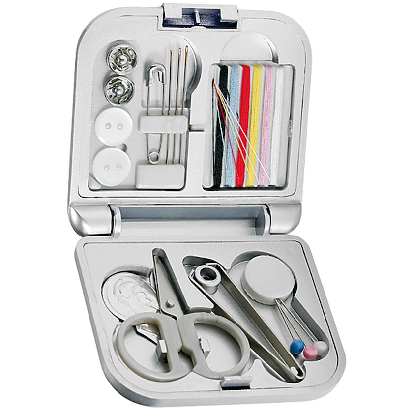 Billigt sysæt i sølvfarvet plastboks.