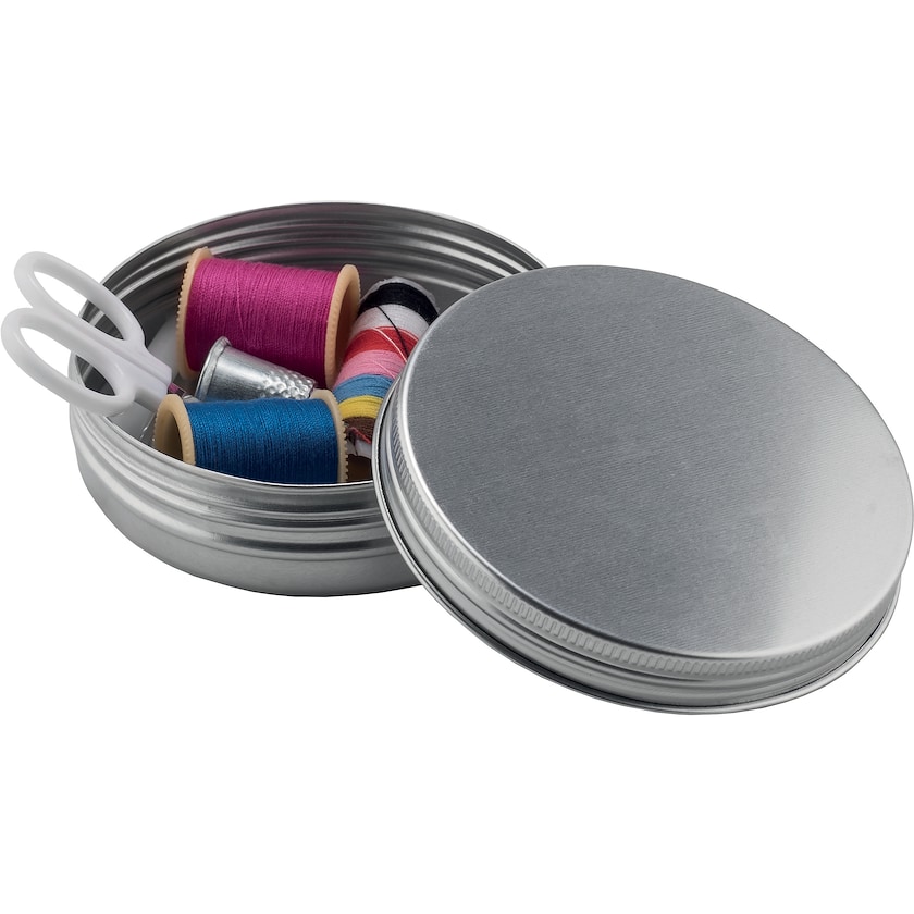 Klassisk rundt syetui af stål. Indeholder blandt andet tråd i forskellige farver, saks, fingerbøl, sikkerhedsnål og knapper. Mærkning kan ske enten ved tryk eller lasergravering.