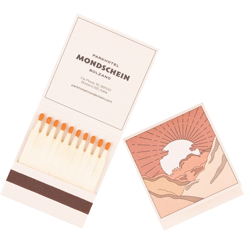 Klassisk tændstikmappe med højglanscoating. Tryk i op til fire farver sker i Pantoneskalaen og derover i CMYK. Du vælger frit blandt 16 forskellige tændstik hovedfarver og 3 forskellige træfarver.