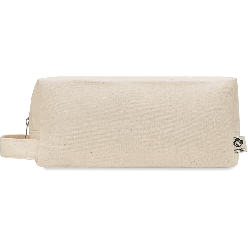Lille toilettaske i økologisk bomuld. Et godt miljøvalg! En etiket viser at toilettasken er fremstillet af økologisk bomuld.