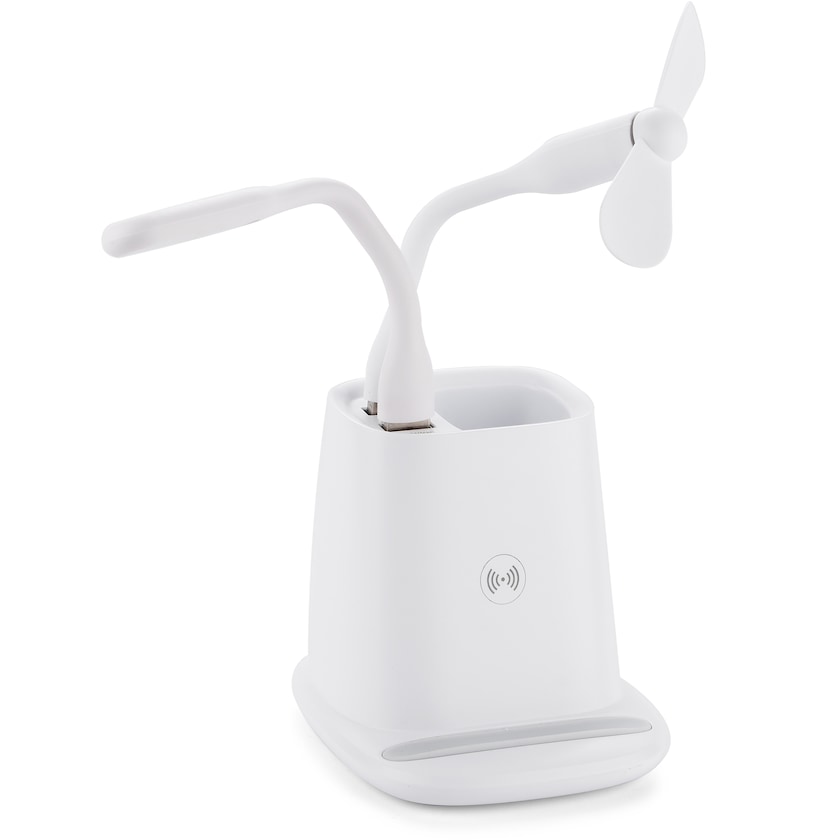 Trådløs oplader kombineret med penneholder, lampe og ventilator. Når opladeren ikke bruges til nogle af funktionerne, fungerer USB-portene som en hub. Leveres i en hvid gaveæske.