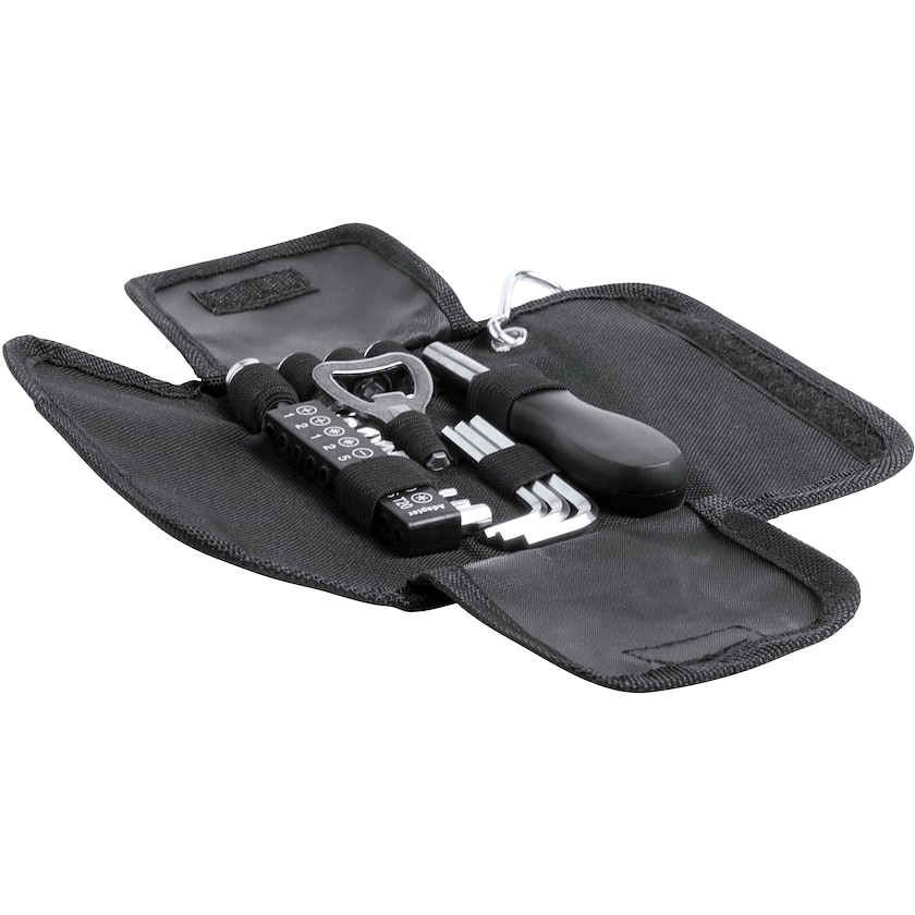 Verktøjssæt med 19 dele i praktisk opbevaring med karbinhage. Tryk kan maks. ske i to farver. Et smart værktøjssæt til mindre reparationer.
